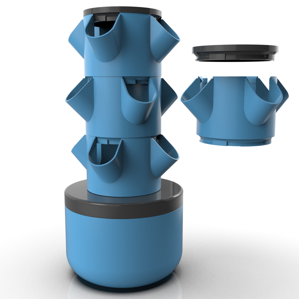 Modular 3D-printable vertical hydroponic tower with twist-lock design and integrated water/electronics flow.