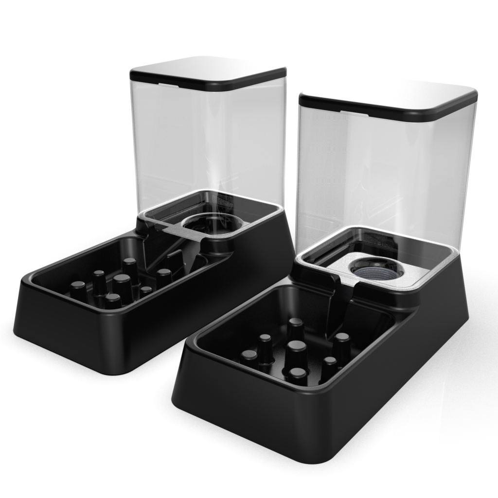 Created elegant black pet dispensers with glass reservoirs, slow-feed patterns for better digestion, and intuitive fill indicators. Combines premium design with functionality for modern pet care.